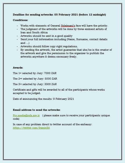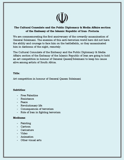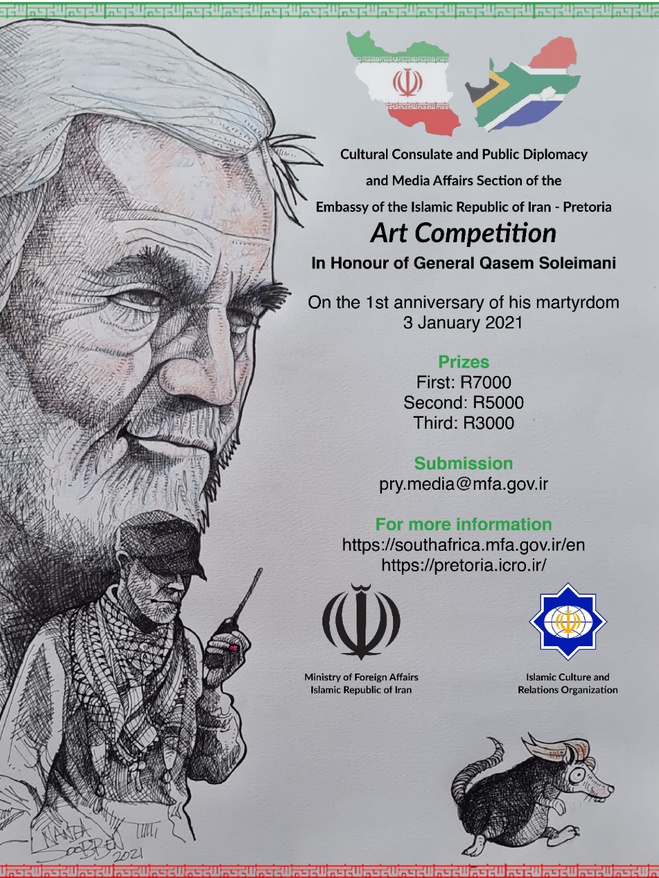 We are commemorating the first anniversary of the cowardly assassination of General Soleimani. The enemies of this anti-terrorism world hero did not have the ability and courage to face him on the battlefields, so they assassinated him in darkness of the night, remotely. The Cultural Consulate of the Embassy and the Public Diplomacy & Media Affairs section of the Embassy of the Islamic Republic of Iran are going to hold an art competition in honour of General Qasem Soleimani to keep his cause alive among artists of South Africa.